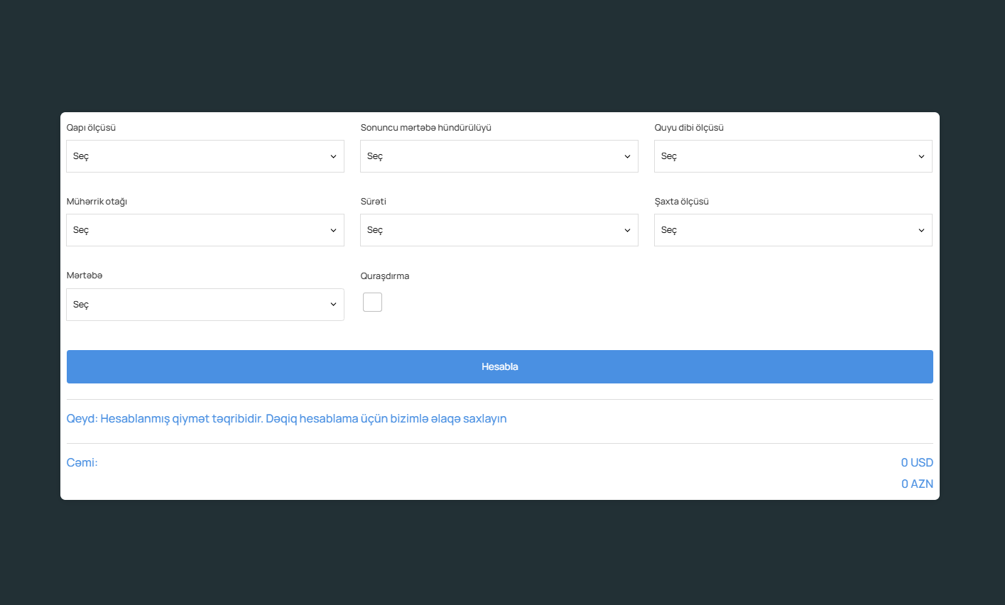 Web saytımızda olan kalkulyatora layihənin ölçülərini daxil edərək lift layihənizin hansı qiymətə başa gələcəyini öyrənə bilərsiniz.